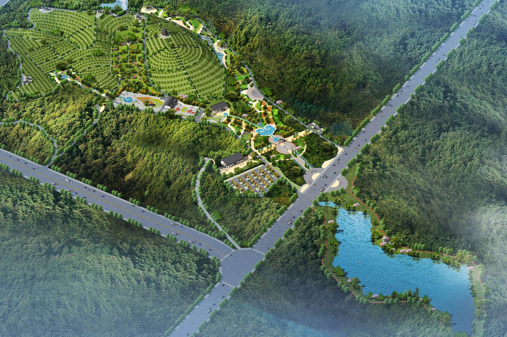 德龍陵園來龍于昆侖山系,屬翠峰山主脈延伸到石馬龍山的團(tuán)山結(jié)穴而建,面朝小閘水庫,太和山與寥廓山左右環(huán)抱,園區(qū)巒聳翠、水映霞輝、山環(huán)水繞、郁郁蔥蔥,有五龍捧圣之勢,冠以五福臨門之愿,五德傳承之感,使山水人文融為一體,是弘揚中華文化的教研基地。
