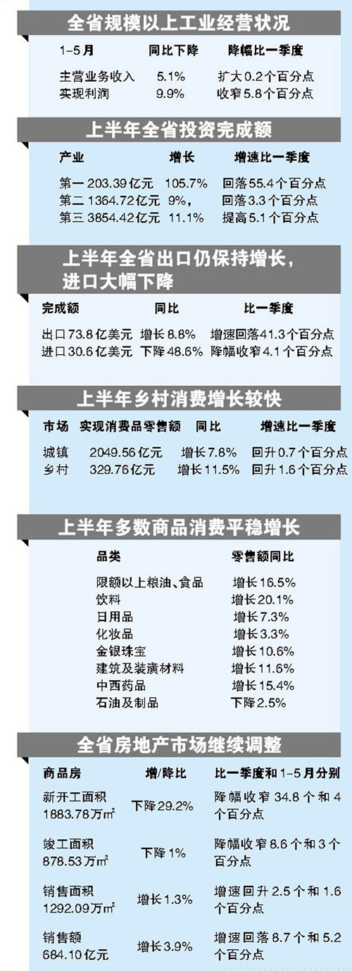 發(fā)布會上,統(tǒng)計局相關(guān)負責人表示,今年上半年,全省經(jīng)濟運行經(jīng)歷了一季度的低迷后,在各項穩(wěn)增長政策的有力作用下,各項經(jīng)濟指標從二季度開始回歸到平穩(wěn)增長的軌道,并呈現(xiàn)企穩(wěn)回升向好的積極態(tài)勢。但穩(wěn)增長壓力依然較大,經(jīng)濟回升的基礎(chǔ)仍有待夯實。隨著狠抓穩(wěn)增長、促改革、調(diào)結(jié)構(gòu)、惠民生、防風險政策措施的落實到位,第三季度將進一步鞏固經(jīng)濟運行回升向好的勢頭,第四季度向著全年預期發(fā)展目標攻堅沖刺,努力實現(xiàn)各項目標任務。